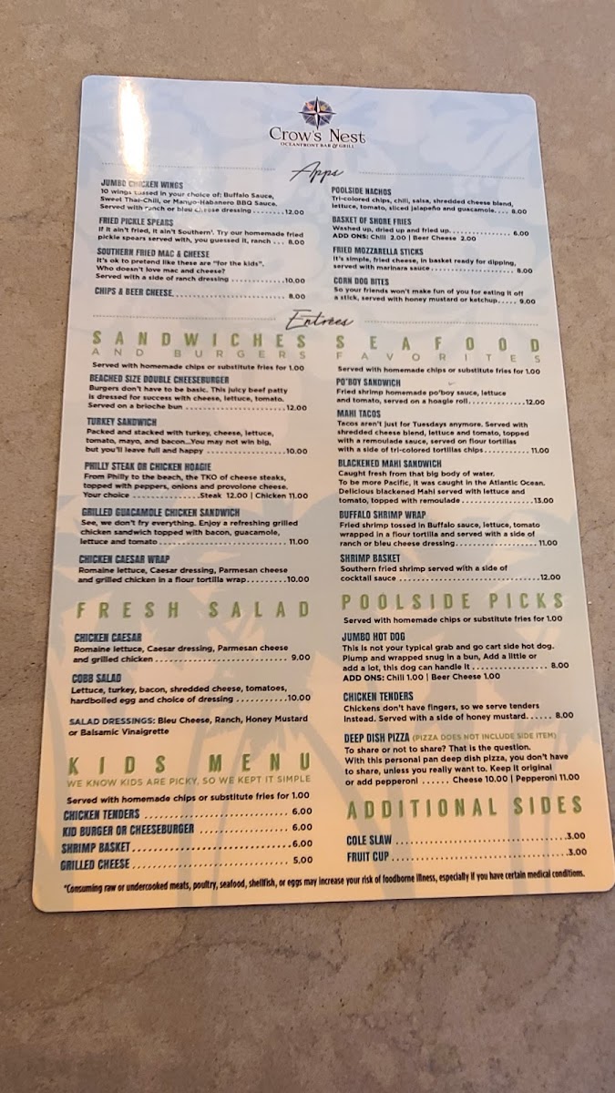 A family-friendly destination, Crow's Nest offers a variety of options for every palate. From kid-friendly Burgers to delectable Fish N Chips and Blackened Mahi Sandwiches, there's something for everyone. Coupled with scenic oceanfront seating and live entertainment, this lively bar and grill is undoubtedly a special place to unwind.